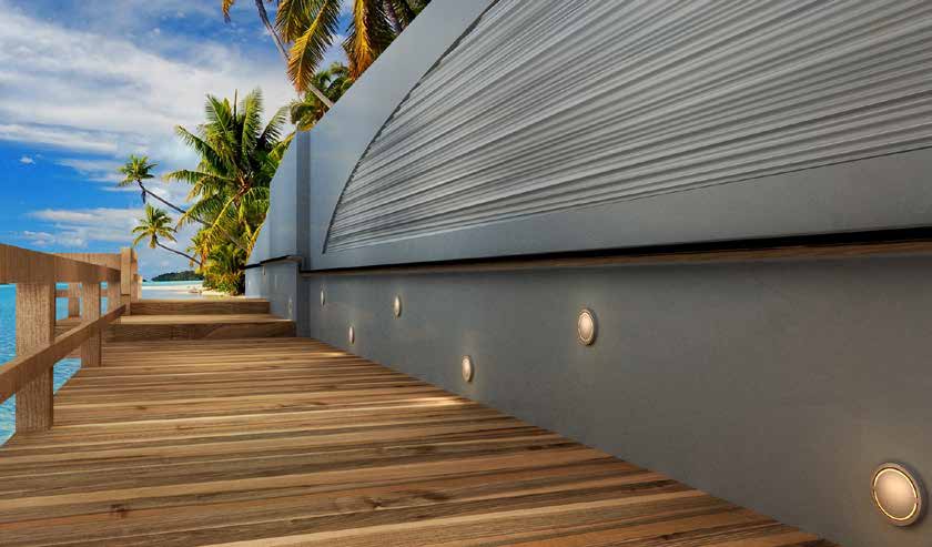 埋込ボックスをモルタルで固定する等の面倒な工事無しで、ウッドデッキに穴を開けるだけで施工が可能な器具です。2m程度の間隔で点在させることで、普通のウッドデッキも一気垢抜けた印象に変わります。