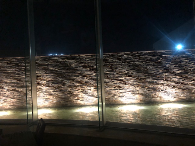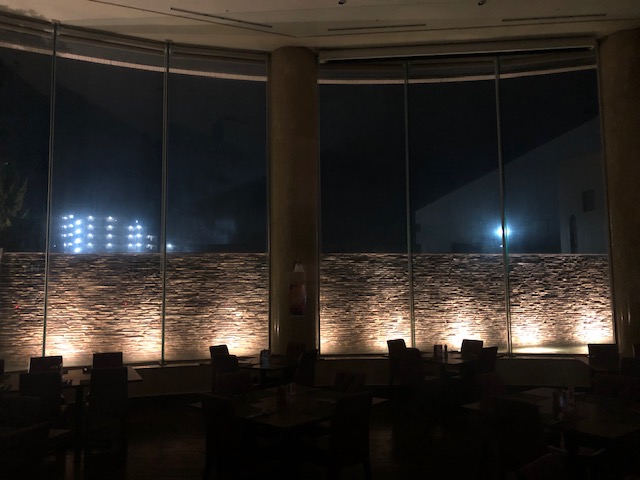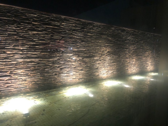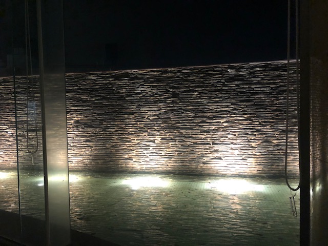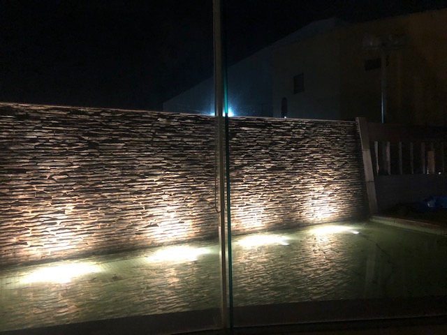 今回は既存なパナソニック器具が球が切れてしまって代替えを探していた。3m位の壁から水が流れていて、その下から水が流れている壁面を照らしたいという要望でした。45°広角なので遠くに光が飛ぶイメージより、横幅の光で演出させるイメージでご指定頂き、電球色を選択された事で茶色の壁が映える演出になりました。