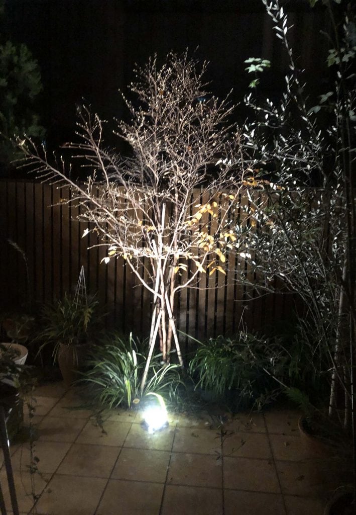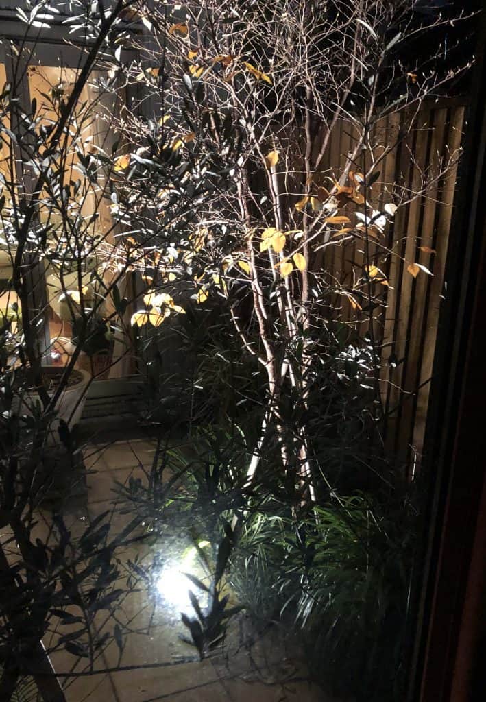 個人住宅の中庭に既設でオーデリックのエクステリアライト(型番:OG043847)が入っていましたが、生産終了品のため交換のタイミングで代替器具として12Wの地中埋込型照明を導入して頂きました。色温度を既設器具の昼白色から電球色に変えたことで、より木の温かみを感じる演出ができました。また、3m程先までしっかりとした光が飛ぶため1台でも植栽を上まで照らすことができ、「中庭が広く感じる」とのお声も頂いております。