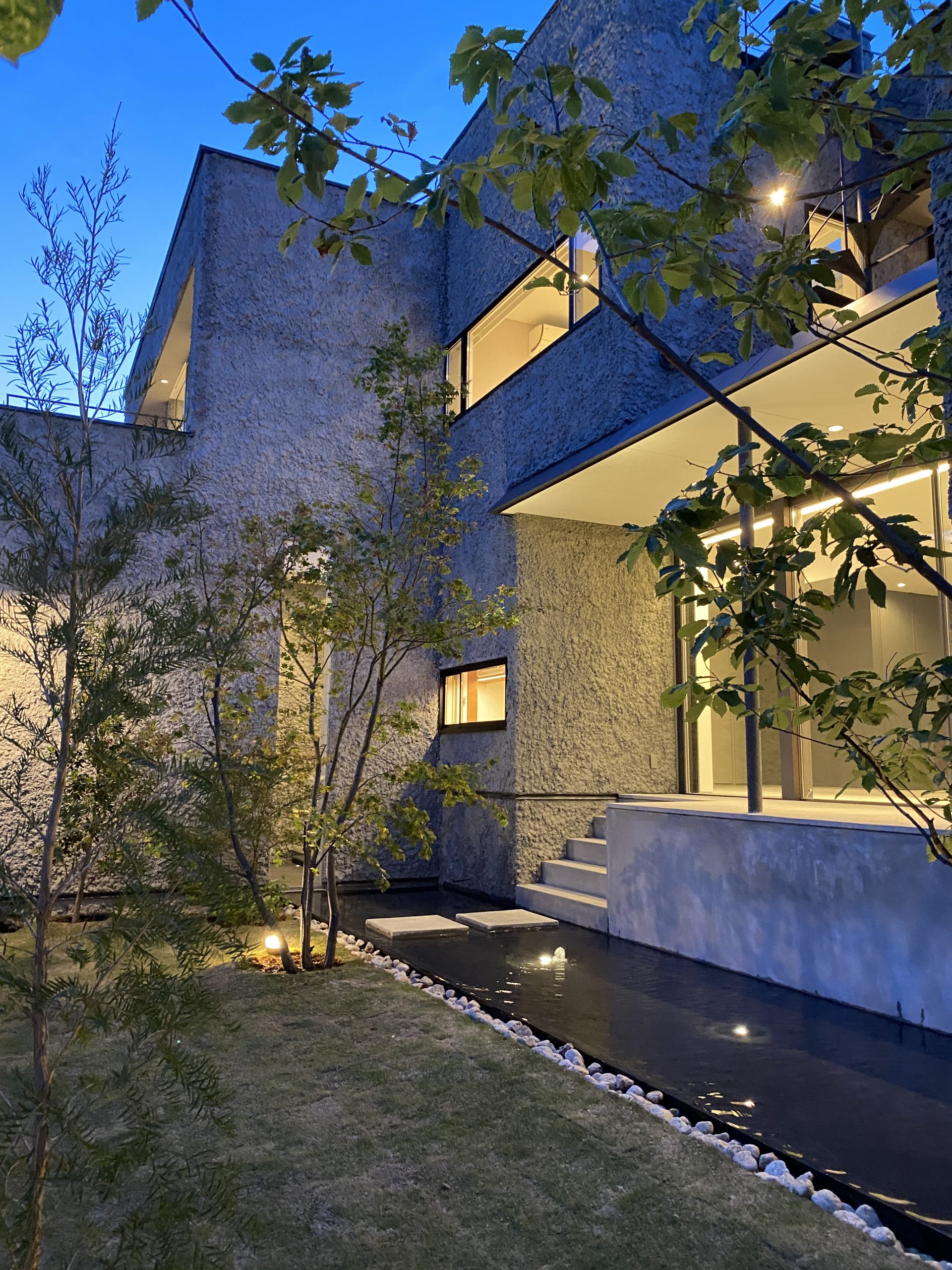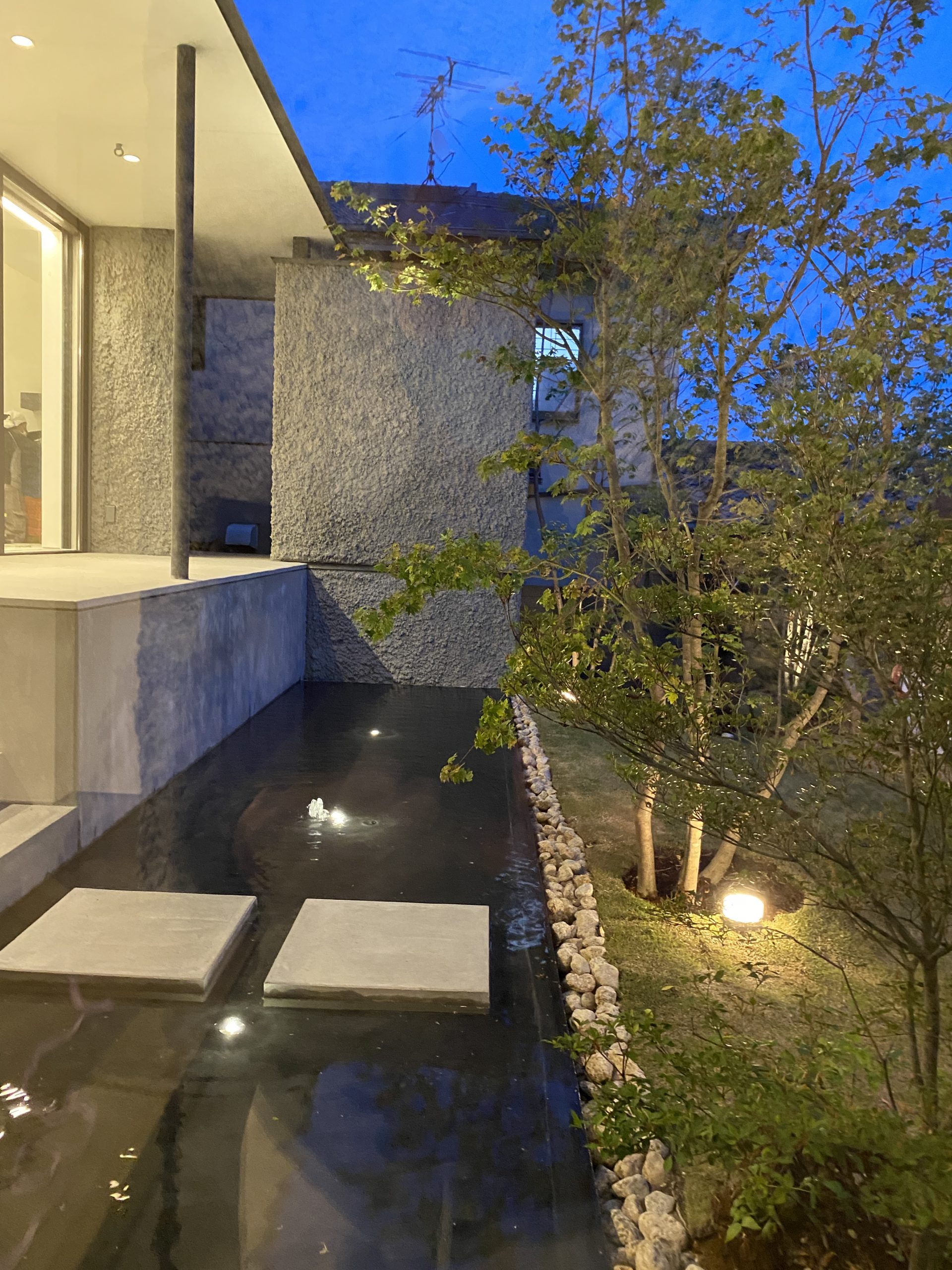 高級個人住宅の屋外水盤に3W壁面埋込型水中照明を3台導入して頂きました。浅い水盤ですが水中照明を設置することで水面の揺らぎが映え、適度な明るさの落ち着く空間に仕上がっています。