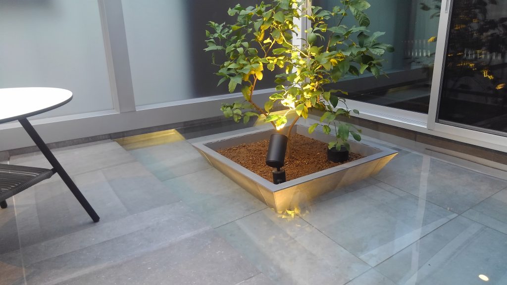 個人住宅の中庭に既設でオーデリックのエクステリアライト(型番:OG043847)が入っていましたが、生産終了品のため交換のタイミングで代替器具として12Wの地中埋込型照明を導入して頂きました。色温度を既設器具の昼白色から電球色に変えたことで、より木の温かみを感じる演出ができました。また、3m程先までしっかりとした光が飛ぶため1台でも植栽を上まで照らすことができ、「中庭が広く感じる」とのお声も頂いております。