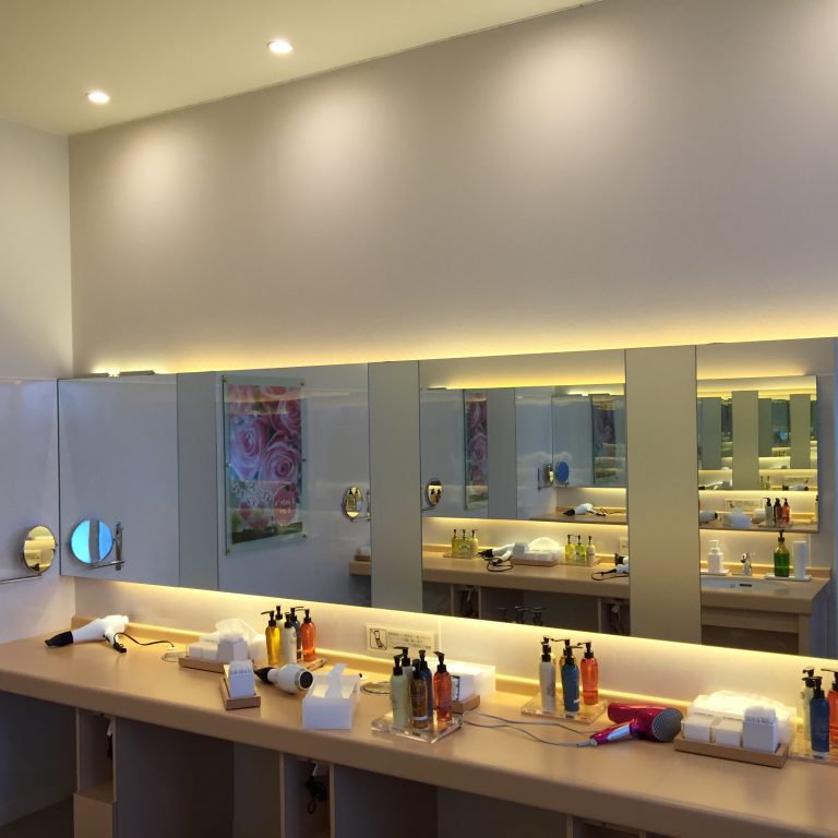 こちらは温泉施設の洗面所の鏡の裏に、テープライトを設置した事例です。店舗ではありませんが、商品を販売する店舗の参考になります。ドライヤーやスキンケア商品が照らされていると、お客様が手に取りやすいですよね。同じようにレイアウトをすれば、商品を手に取ってもらいやすくなります。