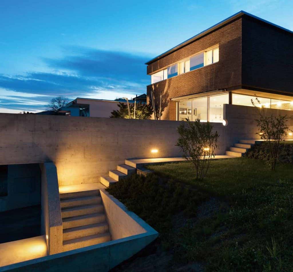 強めの明るさの光が特徴です。間接照明として外壁の、アッパー部分から壁面に光を当てれば、高さ3~4m程度の光の筋を演出することが出来ます。外壁のライトアップには、外壁の印象をガラッとかえることができるほかに、空間に奥行きを演出する効果もあるため、人気の高い演出方法です。