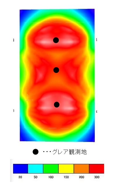グレアとは不快感や物の見えづらさを生じさせるような「まぶしさ」のことを言います。JIS Z 29127スポーツ照明基準でグレアを考慮する必要があるスポーツの場合には許容できるGRの上限値(GRL)を競技により定めています。