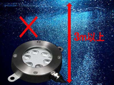 【噴水用水中照明編】LED水中照明使用上の注意噴水用LED水中照明をご使用いただく上で、設置不可の環境や使用上の注意点をご紹介します。設置不可の環境完全に水没ができない場所で使用する3m以上の水深で使用する電源を保護ボックスに入れずに使用するケーブル長を40m以上延長して使用する-20℃以下、45℃以上の水温で使用するコンクリートに埋め込んで使用する使用上の注意点水中以外での15分以上の点灯落下・衝撃を与えるお手入れ時に洗剤を使用する※水で濡らした柔らかい布でやさしく汚れを拭き取ってください。上記のような使い方をすると不点灯・短寿命の原因となります。 絶対にしないでください。噴水用水中照明について もっと詳しく知りたい方はこちら