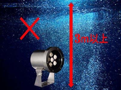 【置き型水中照明編】LED水中照明使用上の注意置き型LED水中照明をご使用いただく上で、設置不可の環境や使用上の注意点をご紹介します。設置不可の環境完全に水没ができない場所で使用する3m以上の水深で使用する電源を保護ボックスに入れずに使用するケーブル長を40m以上延長して使用する-20℃以下、45℃以上の水温で使用するコンクリートに埋め込んで使用する使用上の注意点水中以外での15分以上の点灯落下・衝撃を与えるお手入れ時に洗剤を使用する※水で濡らした柔らかい布でやさしく汚れを拭き取ってください。光を長時間直視する上記のような使い方をすると不点灯・短寿命の原因となります。 絶対にしないでください。置き型水中照明について もっと詳しく知りたい方はこちら