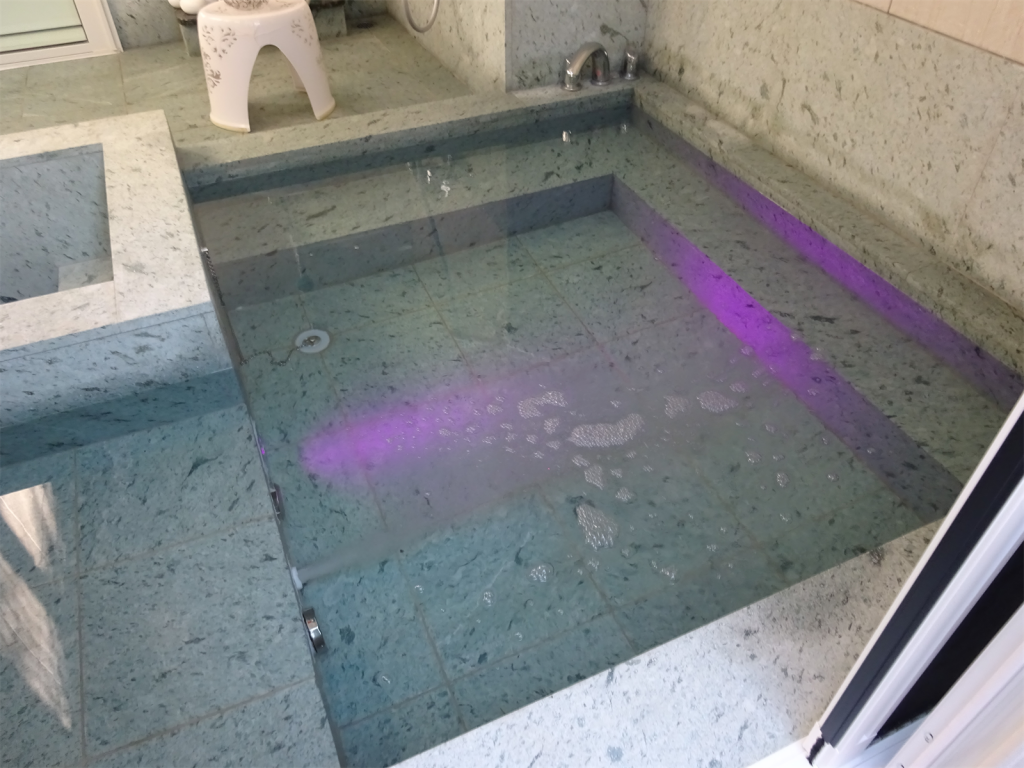 個人住宅の浴槽8W壁面埋込水中照明器具 [色温度:RGB 配光角度:30° 台数:1台]個人住宅の浴槽に埋込型の水中照明器具を設置しました。-20~45℃の範囲内であれば、浴槽にも水中照明器具を設置して頂くことが可能です。RGBタイプにすればリモコンで簡単にカラフルなライト演出ができます。 詳細はこちら8W壁面埋込水中照明器具 [型番]FCB4XC0418 株式会社富士メディシィエ製 [色温度]RGB[配光角度]30° [動作温度]-20~45℃ [電圧]DC24V [使用台数]1台 LED壁面埋込タイプ水中照明