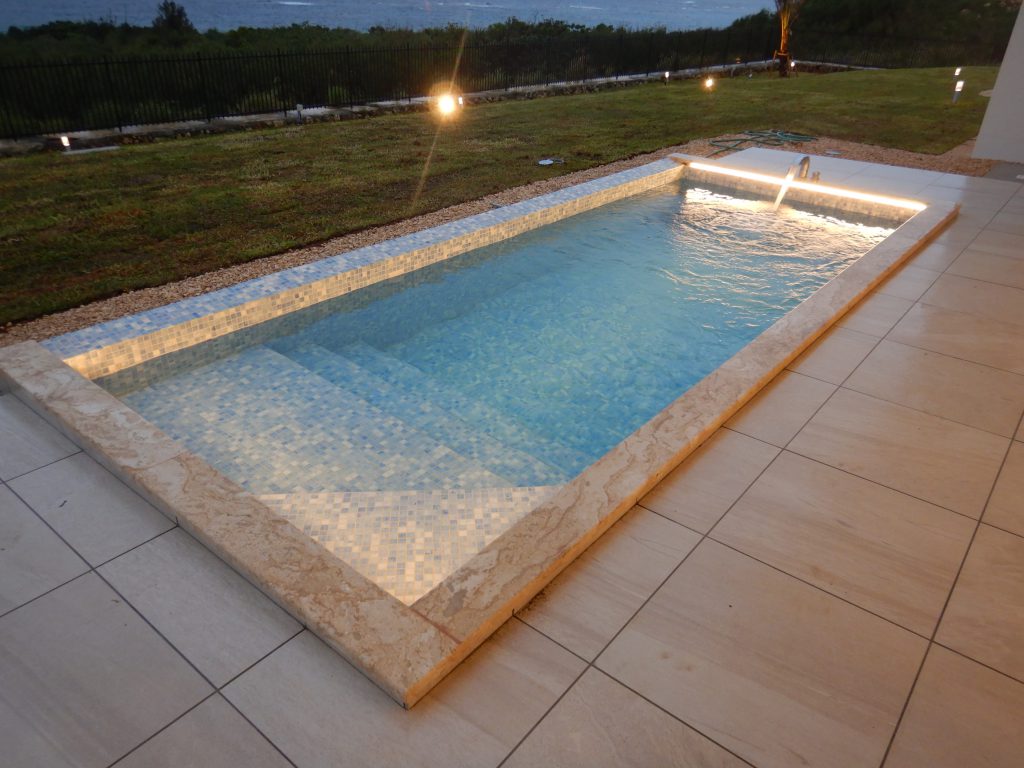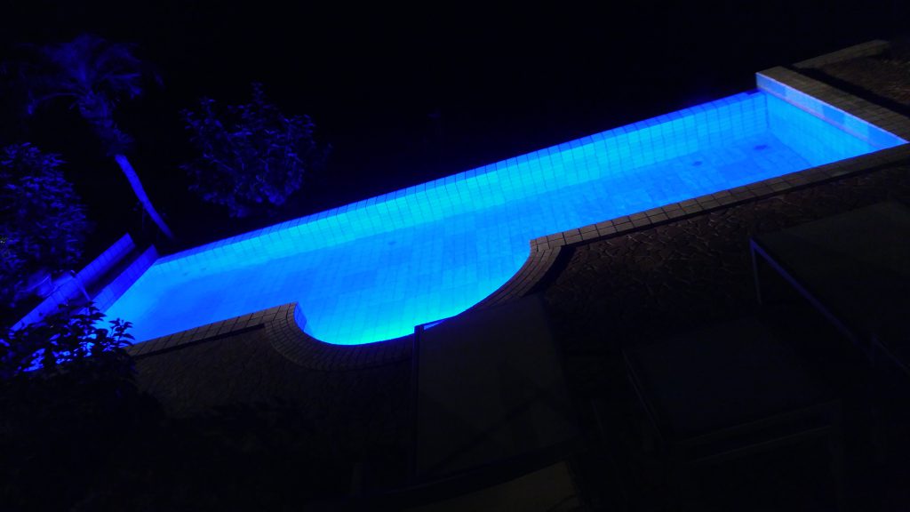 個人住宅の屋外プールに水中テープライトを導入した事例です。30年以上前に造られたプールですが、庭全体を改装し弊社のライン照明を設置するだけで、ハワイアンリゾート風のお庭に早変わりしました。