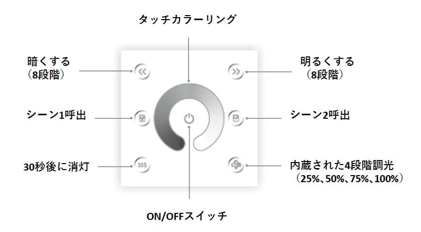 タッチするだけで明るさ調整ができます。カンタン操作でコンパクトな調光器です。リモコン操作なコントローラーと比べて電池交換などの手間かかることがない、リモコンなくなると困るという考え方がある方におすすめです。