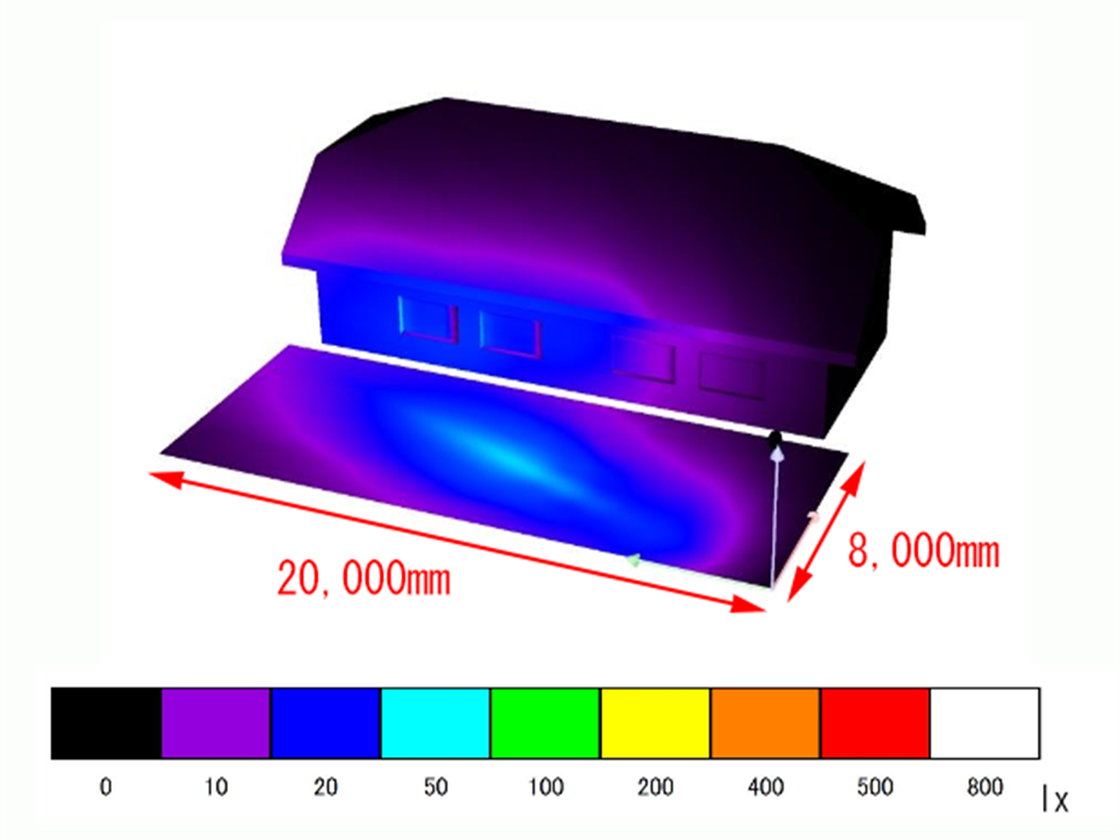 中角タイプ(30°)をコーナーに1灯設置した場合の照度シミュレーション