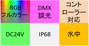 温泉水(最大-40~60℃)、真水に入れて使用できる水中RGBカラー型 LEDテープライト(100%ポリウレタン)です。2年間の保証が付き、またポリウレタンを使用しているので、屋外で使用してもテープライトが白く濁って光が弱くなる、ひび割れが起こるといったトラブルが起こりにくい製品仕様となっています。