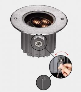 強い光のアッパーライト演出が可能で、照らす角度を調節できるできるタイプの地中埋込型照明器具です。壁面を照らせば、奥行きのある空間演出ができます。またアッパーから照らす防犯灯としてのご利用もおすすめです。