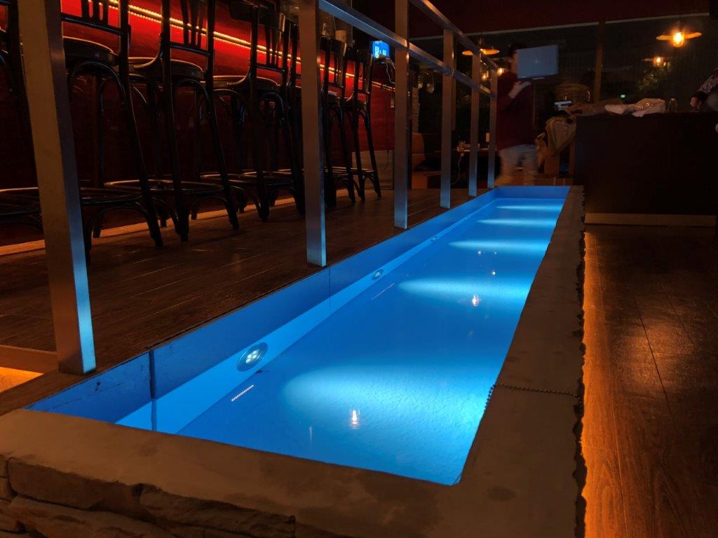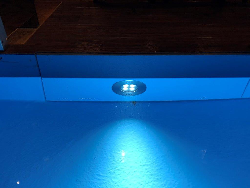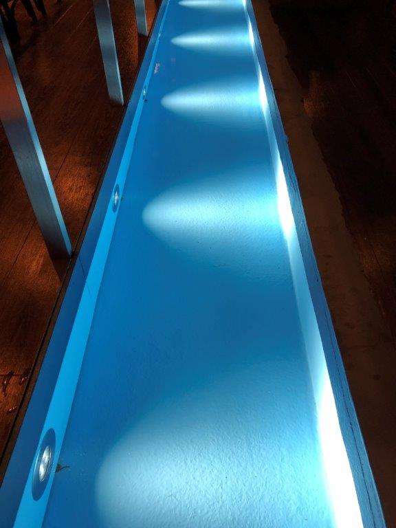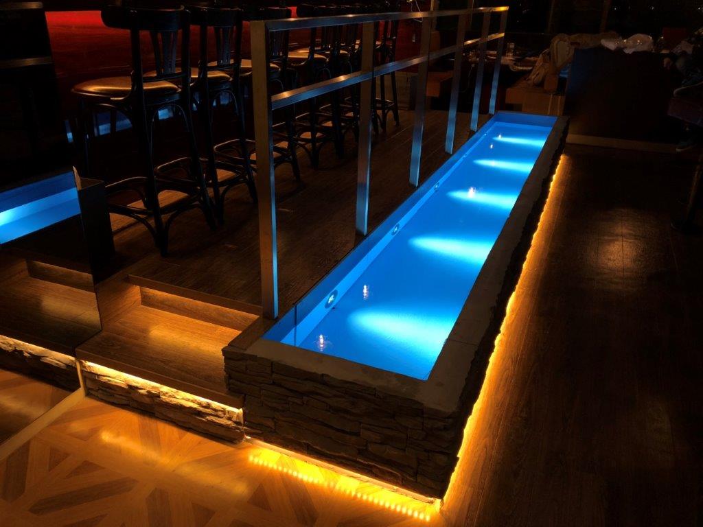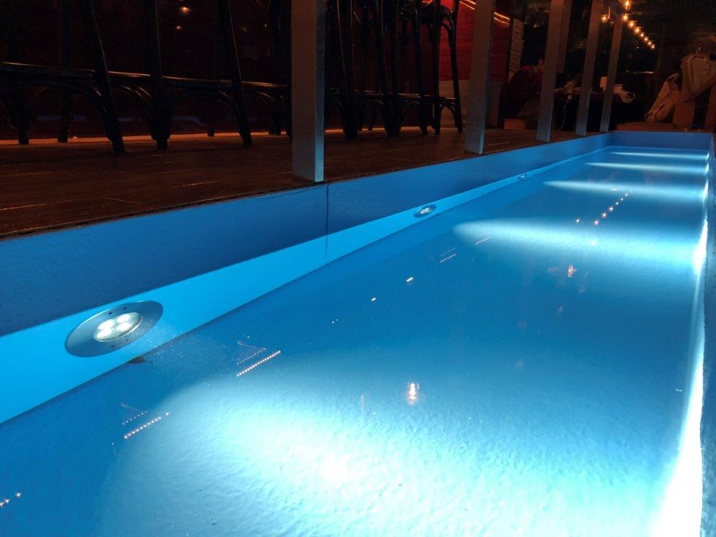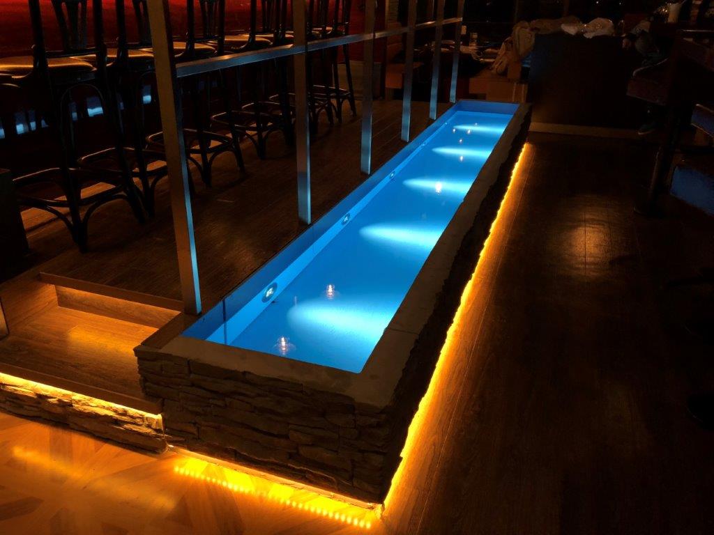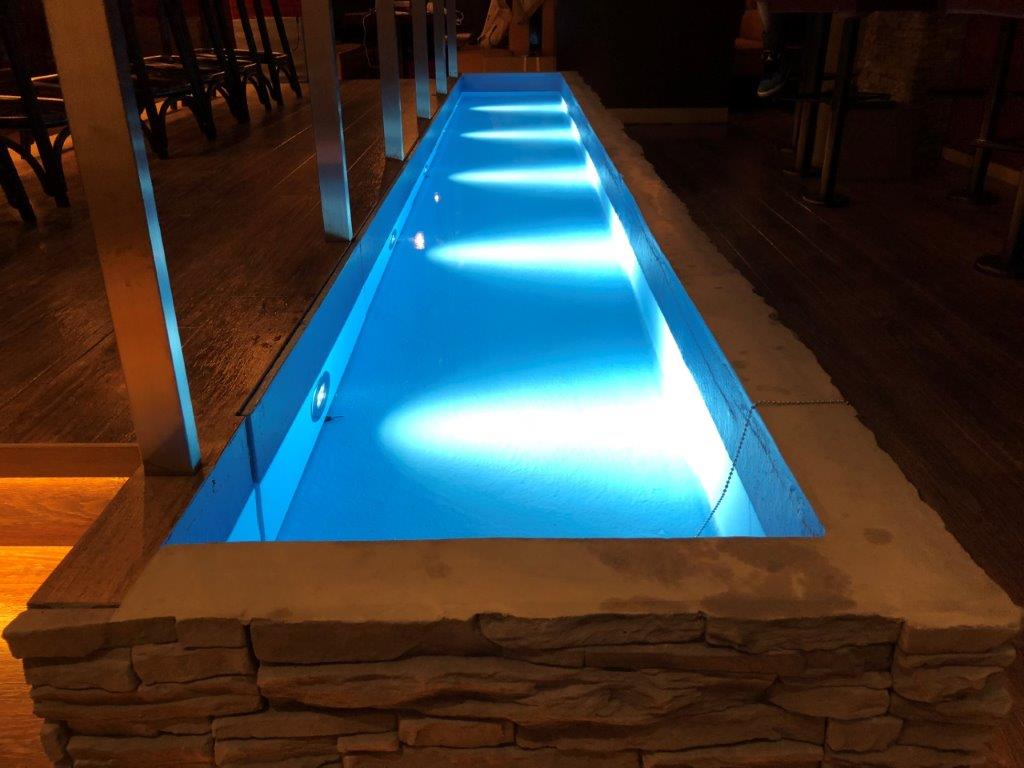 「以前より100倍良くなったね!」とお褒めの言葉を頂きました。お客様のイメージ通りのナイトプールのように演出にできた事が1番良かったです。施工方法としましては、町の飲食店なので水槽(プール)がFRPで出来ており、穴の寸法に合わせて埋込ボックスを板に挟み込むようにして施工しました。