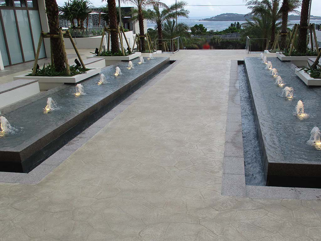 水深が浅い噴水をオレンジの電球色にして高級感を演出